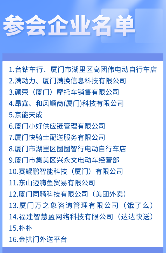 厦门市局钟向阳总工程师、有关处室负责人、电动自行车规范管理专班有关人员以及16家电动自行车租赁企业负责人参会。