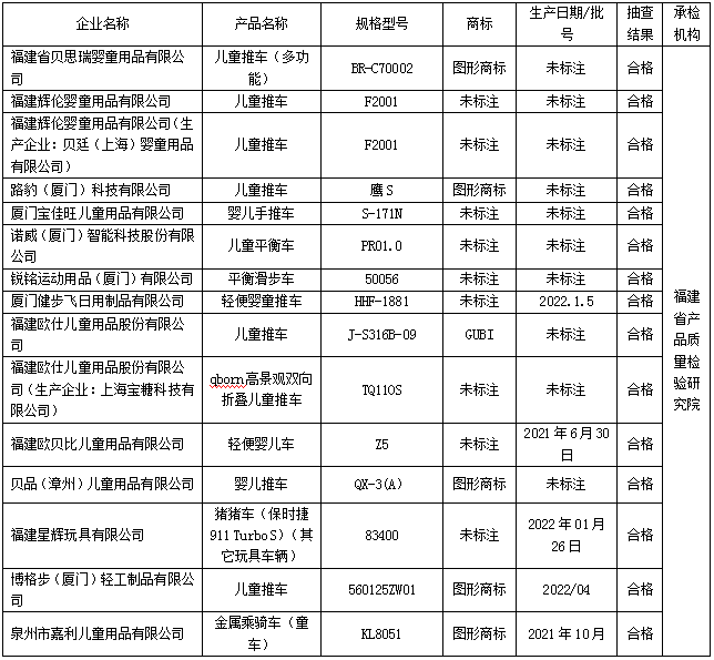 近期,依据《中华人民共和国产品质量法》和相关产品标准及抽查细则明确项目,福建省市场监督管理局组织对童车产品开展产品质量省级监督抽查,共抽查13家生产企业15批次产品,合格率为100%。