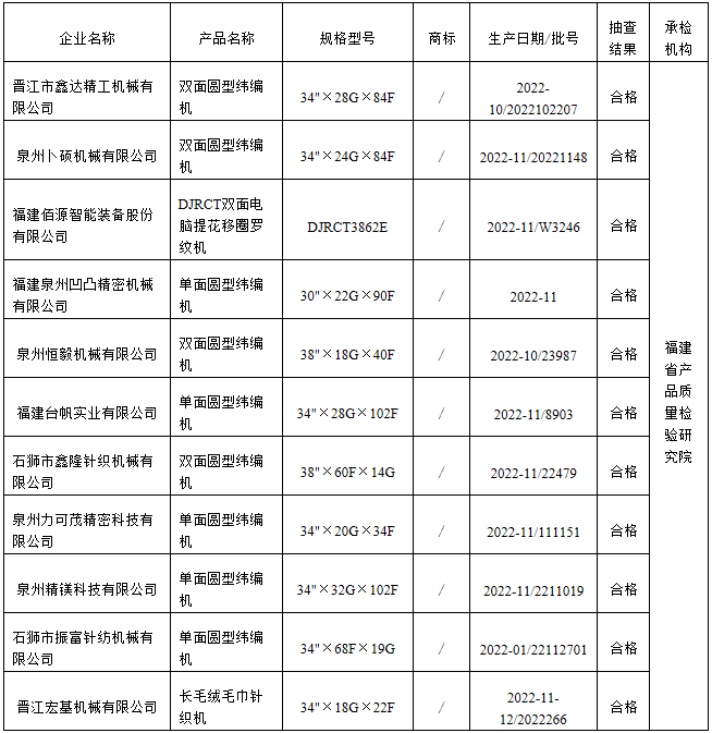 福建省圆型纬编机产品质量省级监督抽查结果(合格)