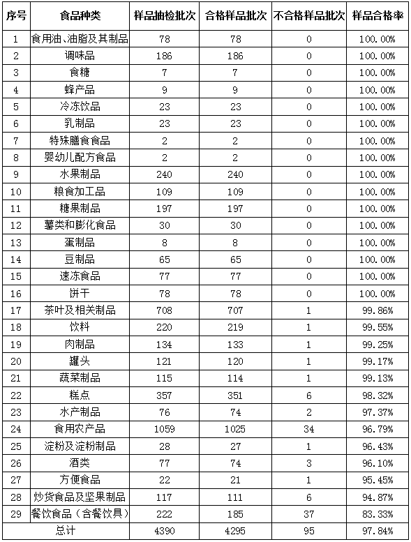 2021年上半年,省市场监管局本级(以下简称省局本级)在全省范围内共监督抽检29大类食品4390批次样品,其中合格样品4295批次,不合格样品95批次,总体合格率97.84%。