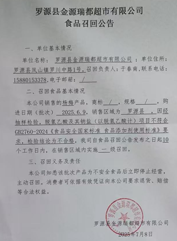 罗源县金源瑞都超市有限公司食品召回公告(20250708)