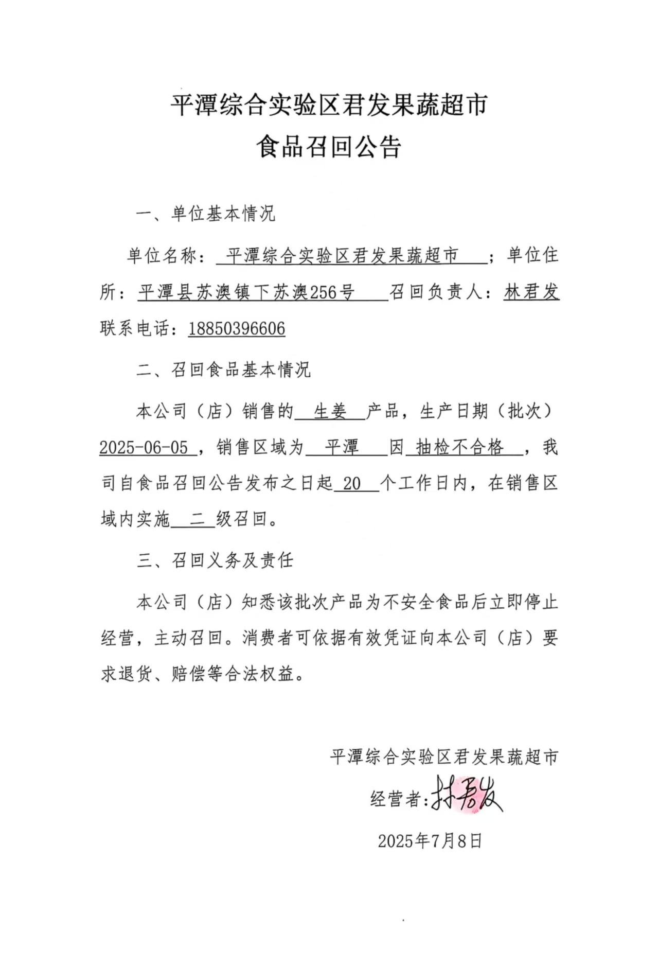 平潭综合实验区君发果蔬超市食品召回公告(20250708)