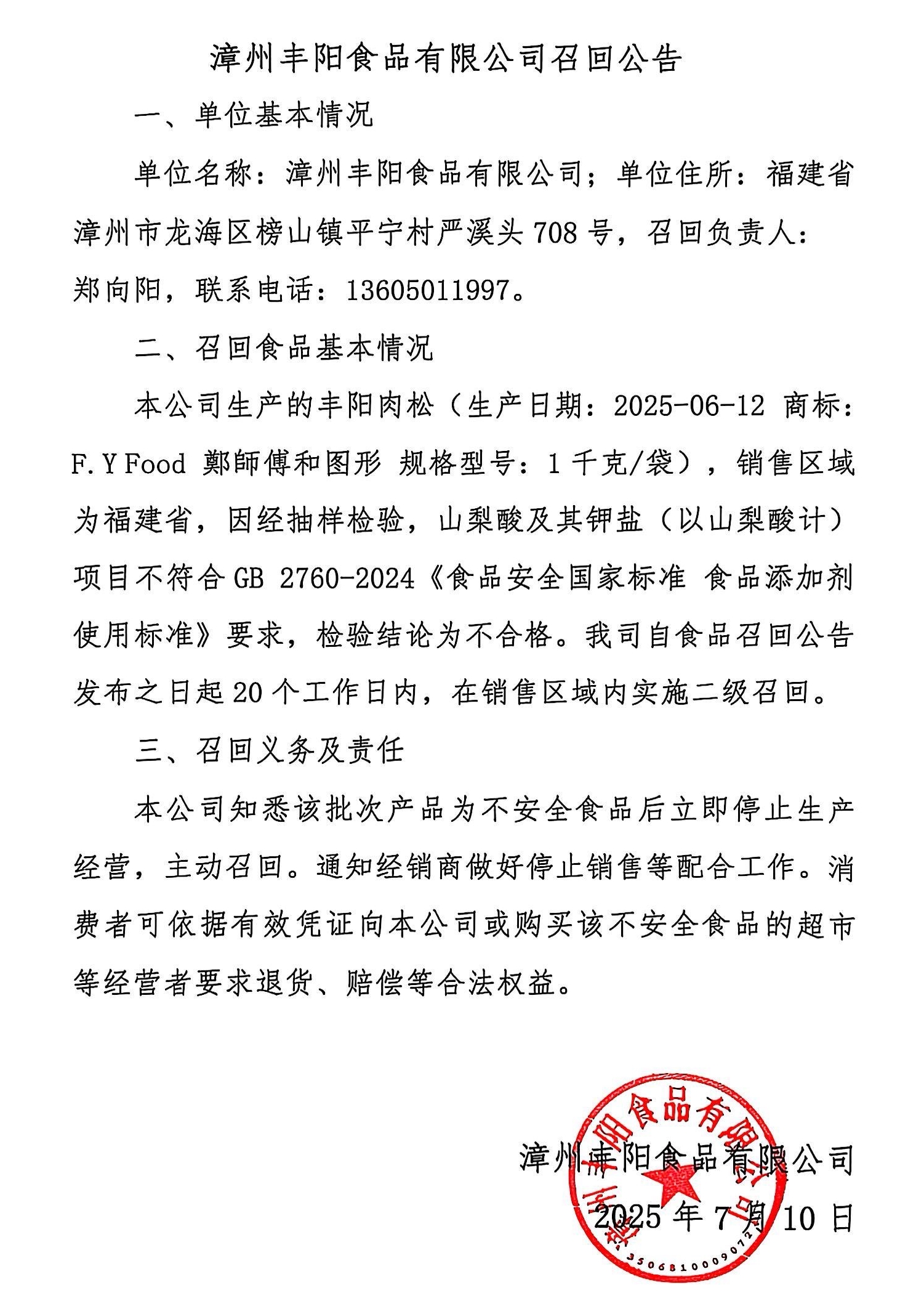 漳州丰阳食品有限公司食品召回公告(20250710)