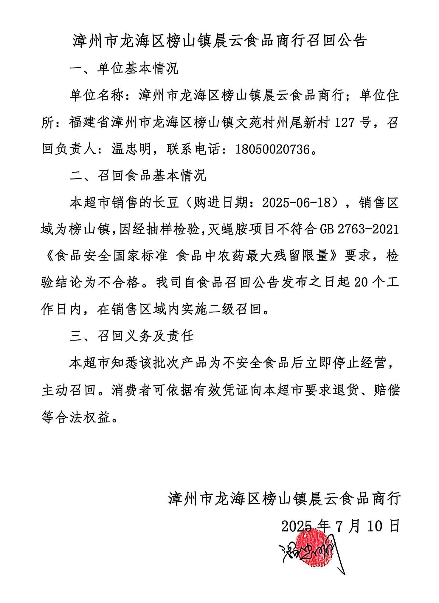 漳州市龙海区榜山镇晨云食品商行食品召回公告(20250710)