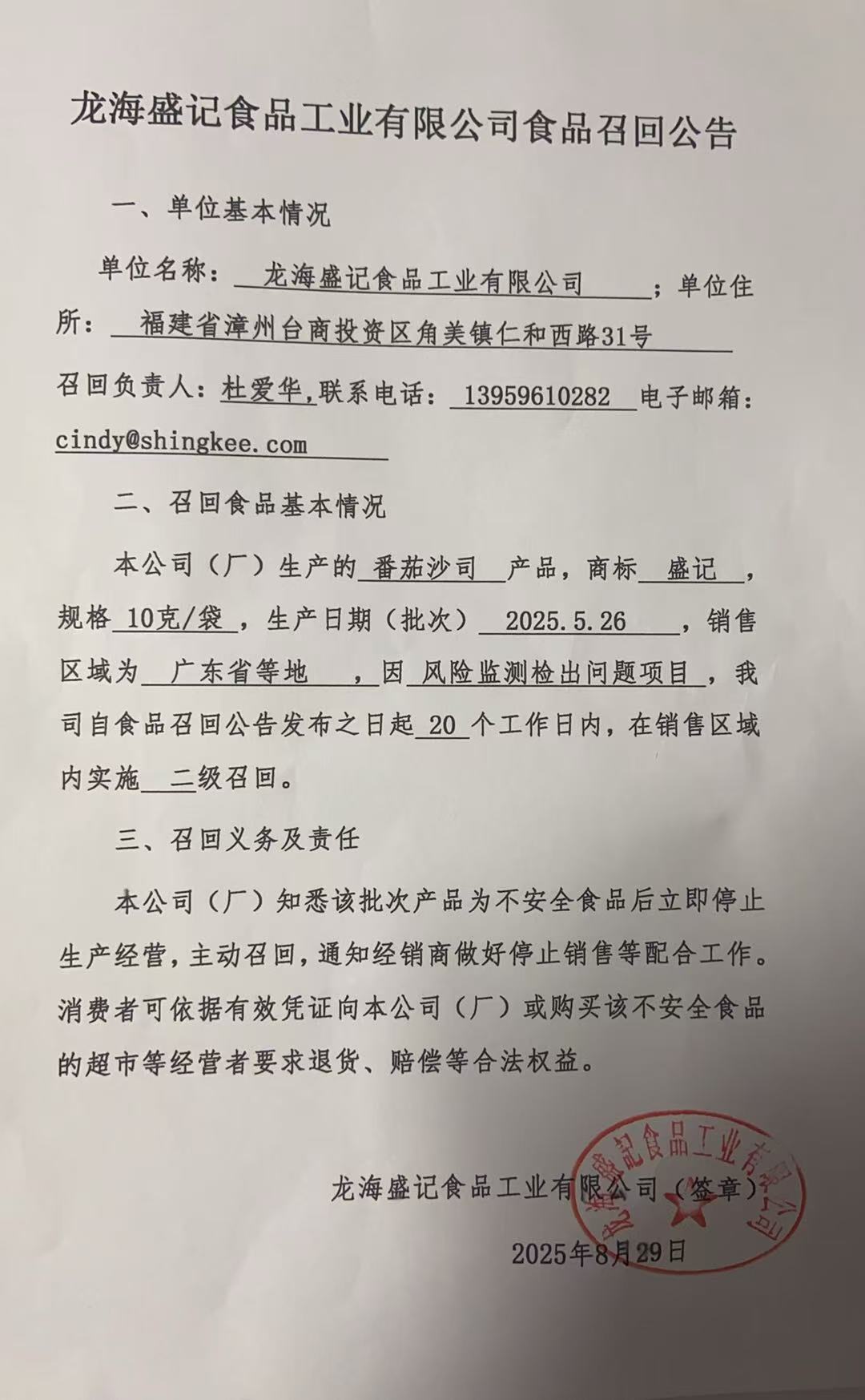 龙海盛记食品工业有限公司食品召回公告(20250829)