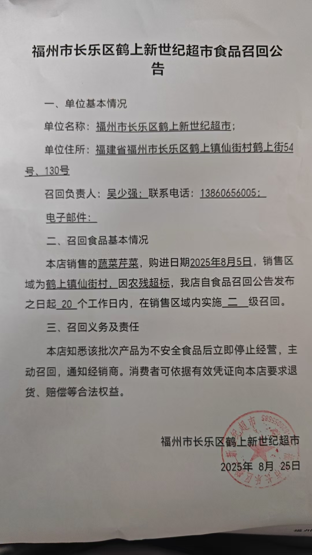 福州市长乐区鹤上新世纪超市食品召回公告(20250825)