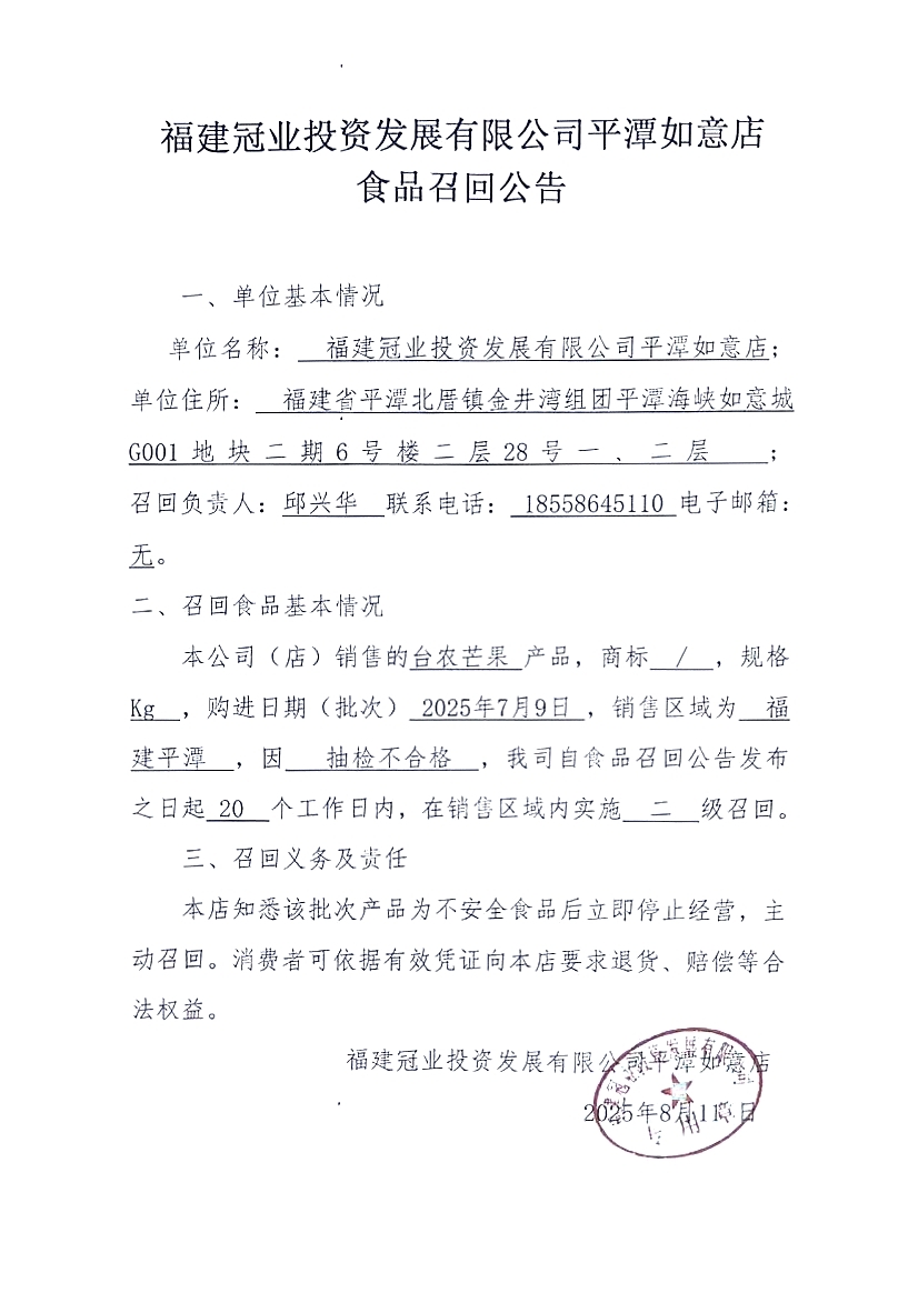 福建冠业投资发展有限公司平潭如意店食品召回公告(台农芒果)(20250811)