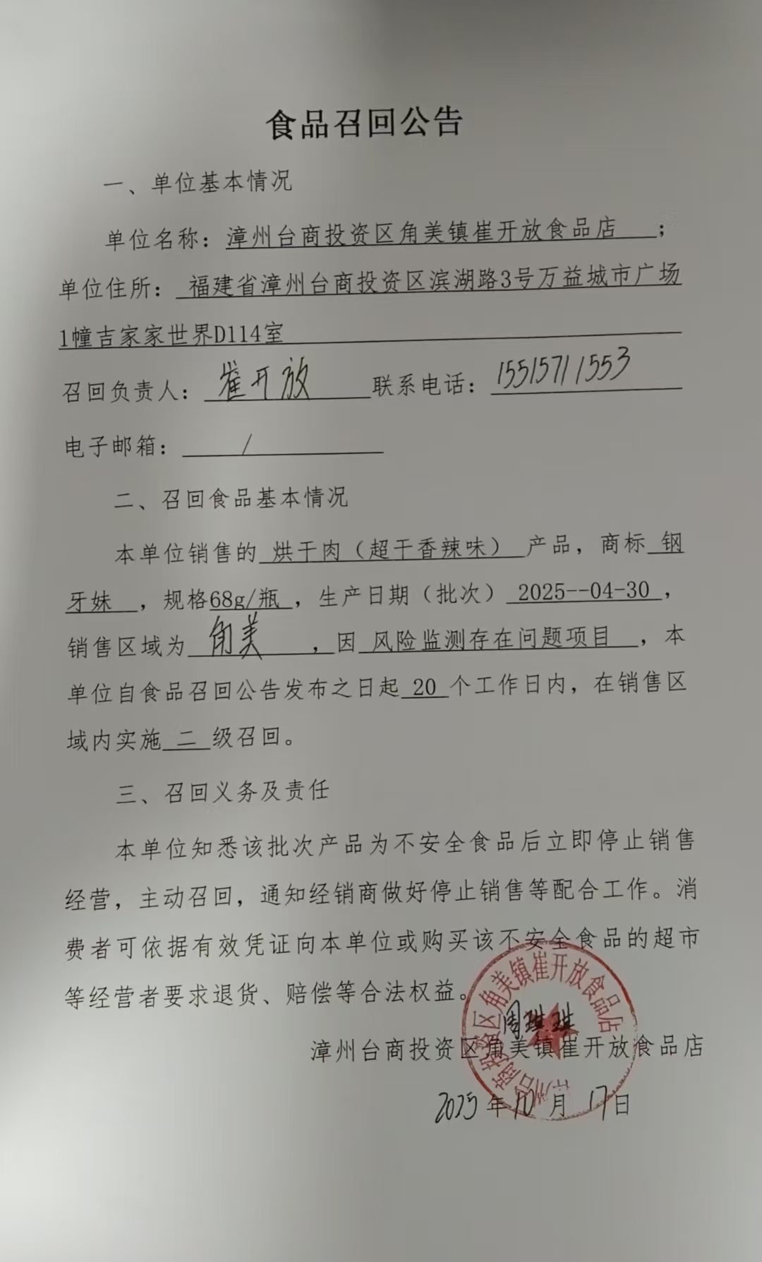 漳州台商投资区角美镇崔开放食品店食品召回公告(烘干肉超干香辣味)(20251017)