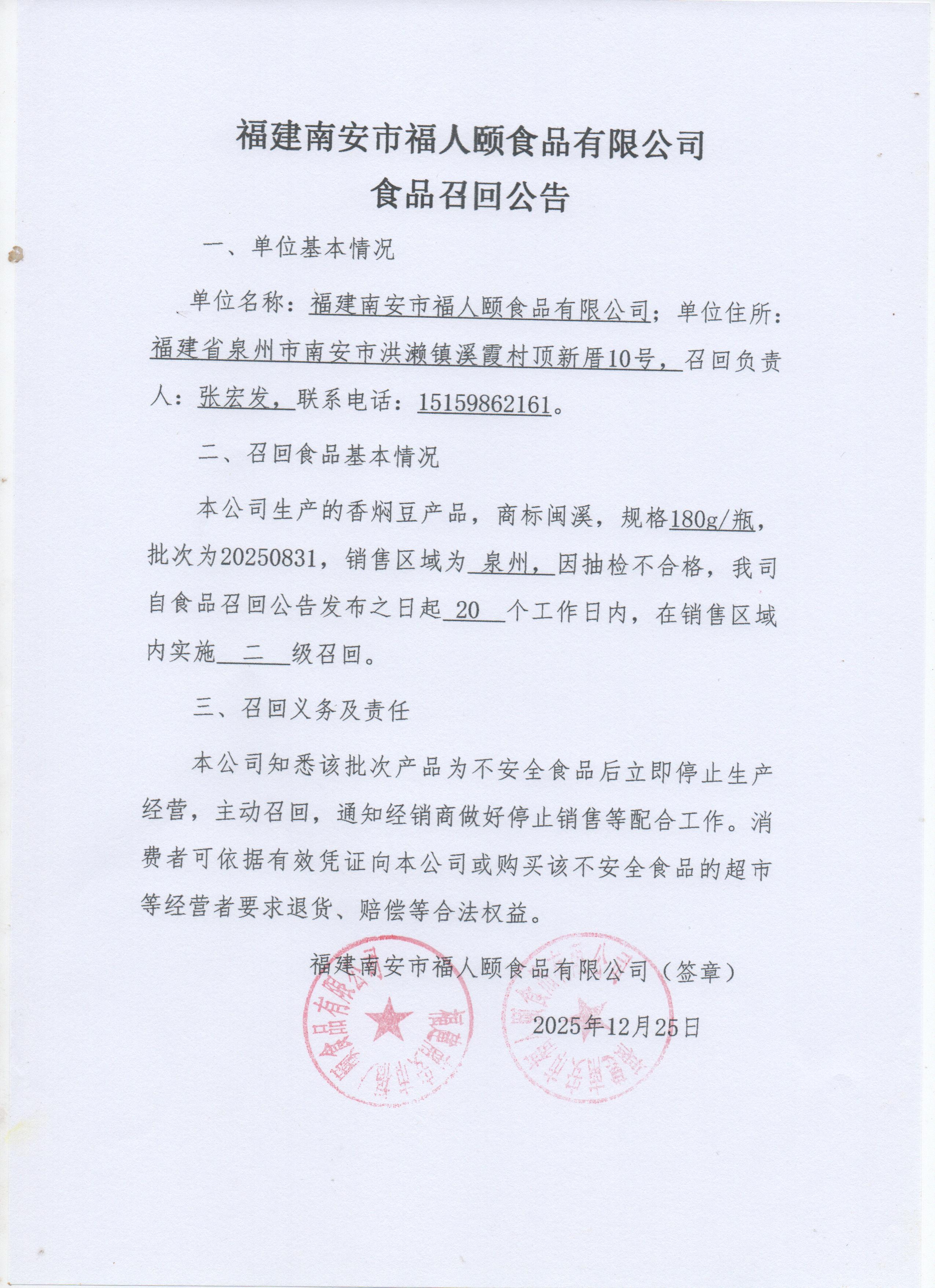 福建南安市福人颐食品有限公司食品召回公告(20251225)