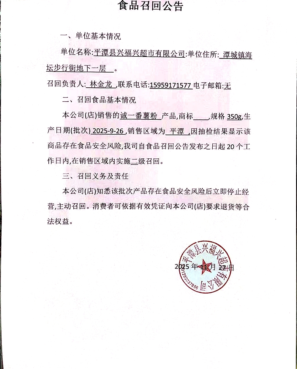 平潭县兴福兴超市有限公司食品召回公告(番薯粉)(20251127)