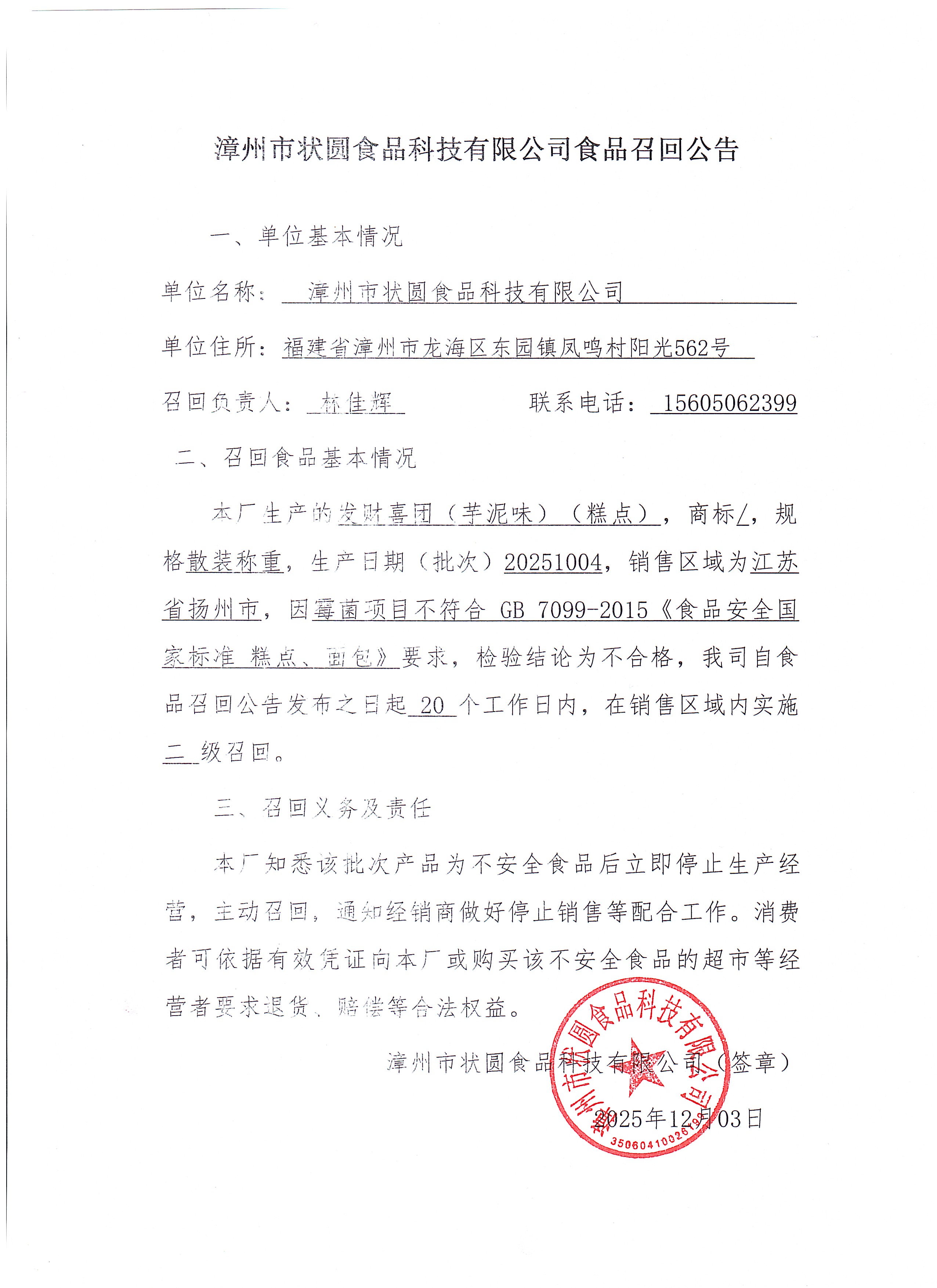 漳州市状圆食品科技有限公司食品召回公告(发财喜团(芋泥味)(20251203)