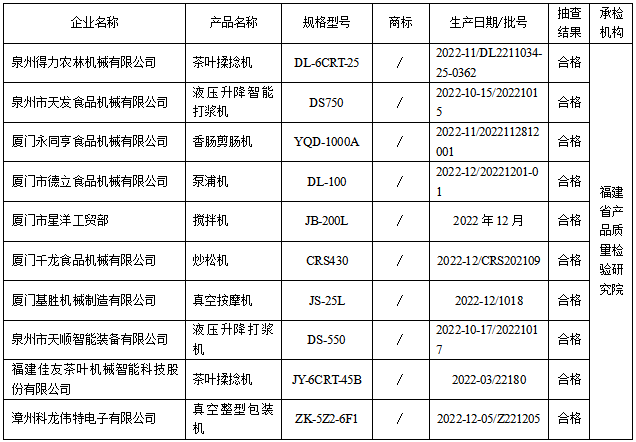 福建省食品机械产品质量省级监督抽查结果(合格)