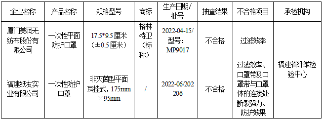 表2 福建省非医用口罩产品质量省级监督抽查结果(不合格)