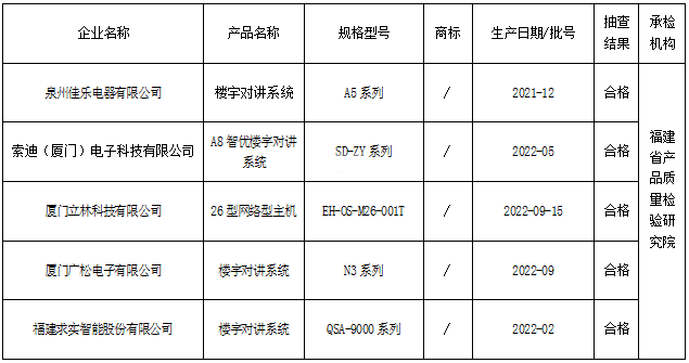 福建省楼寓对讲系统产品质量省级监督抽查结果(合格)