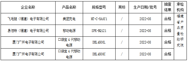 福建省移动电源(充电宝)产品质量省级监督抽查结果(合格)