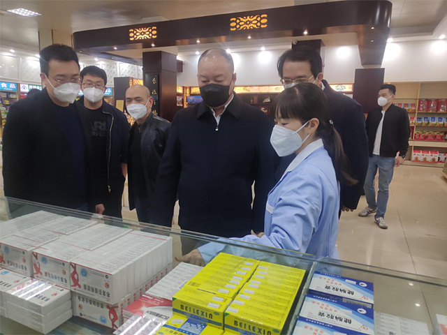 在康佰家石狮德辉店,刘小宁组长详细了解药店引导群众正确用药相关宣传措施、涉疫药品和医疗用品库存和价格情况以及基层市场监管部门发放规范防疫药品价格行为提醒告诫书(函)等工作情况。