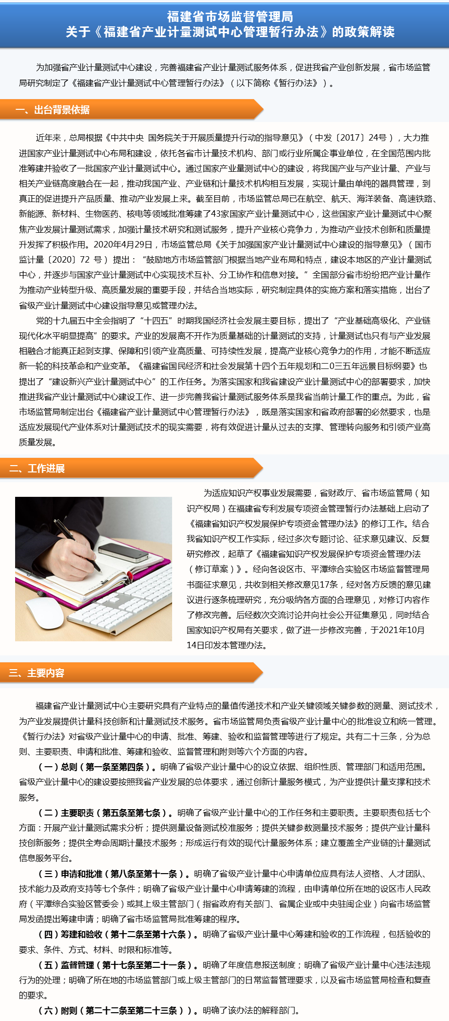 (一)总则(第一条至第四条)。明确了省级产业计量中心的设立依据、组织性质、管理部门和适用范围。省级产业计量中心的建设要按照我省产业发展的总体要求,通过创新计量服务模式,为产业提供计量支撑和技术服务。
