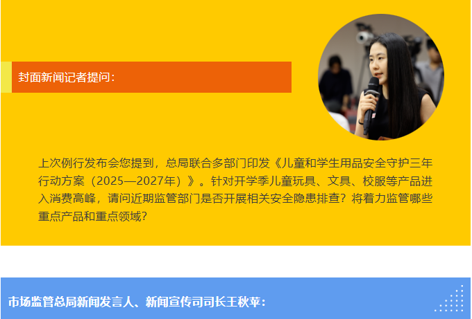 正如您所说,我们正在扎实推进儿童和学生用品安全守护三年行动,全力守护孩子们“学、玩、穿、用、行”每一道安全关。我们坚持从源头严防、过程严管、风险严控。