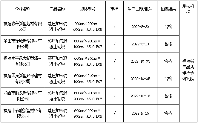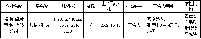 近期,依据《中华人民共和国产品质量法》和相关产品标准及抽查细则明确项目,福建省市场监督管理局组织对生产企业新型墙体材料(砖和砌块)产品质量开展省级监督抽查。本次共抽查7家生产企业7批次,其中1批次不合格,不合格发现率为14.3%。