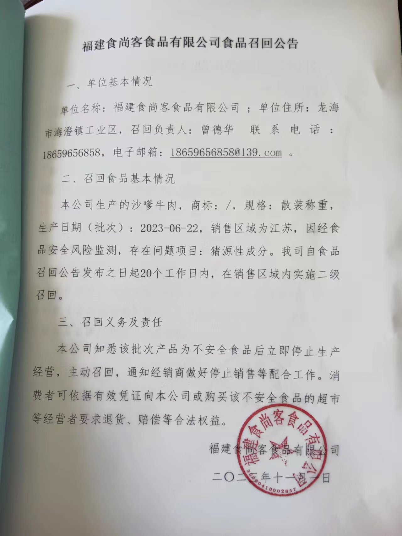 福建食尚客食品有限公司食品召回公告(20231101)