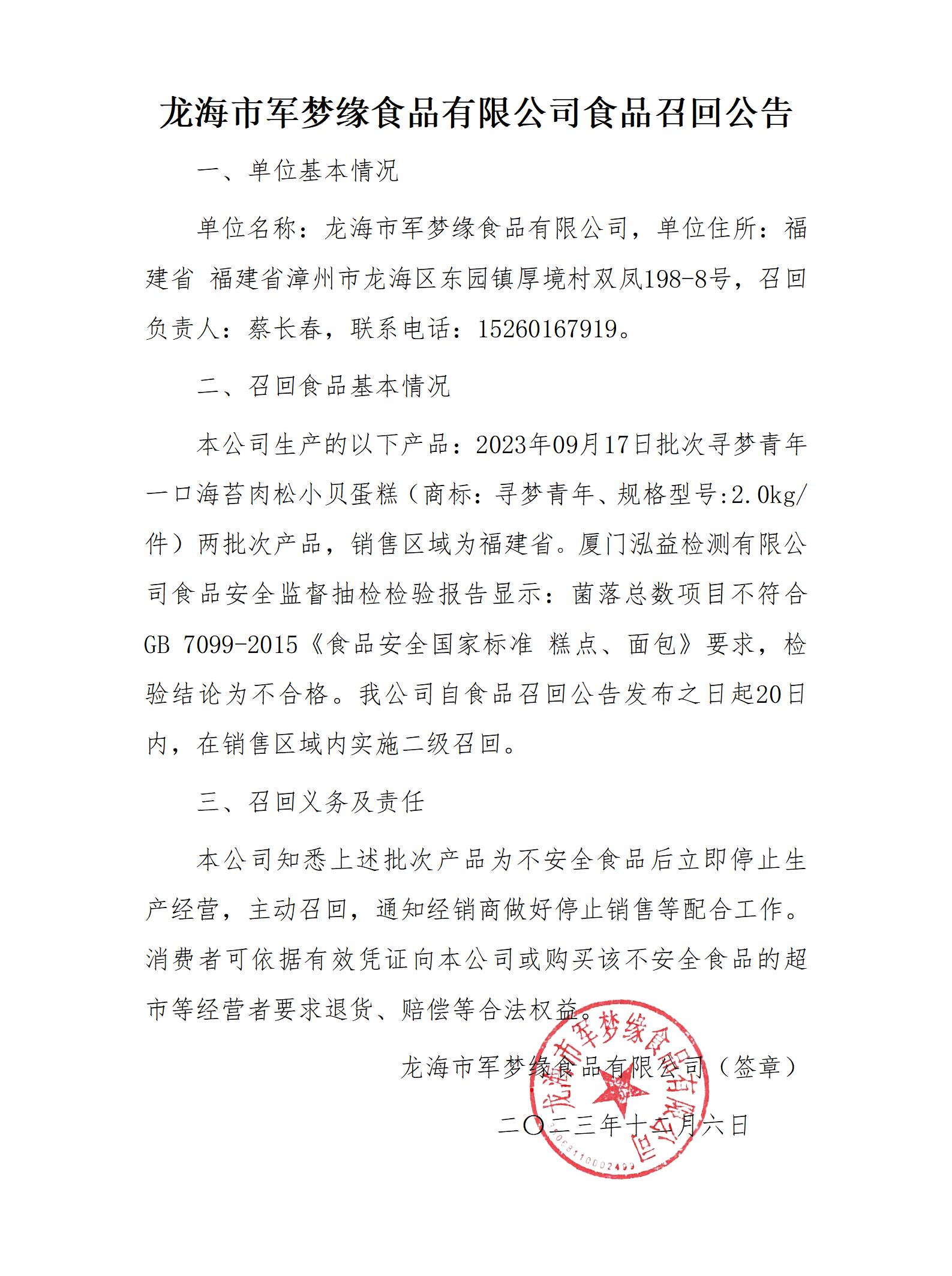 龙海市军梦缘食品有限公司食品召回公告(一口海苔肉松小贝蛋糕0917)(20231206)