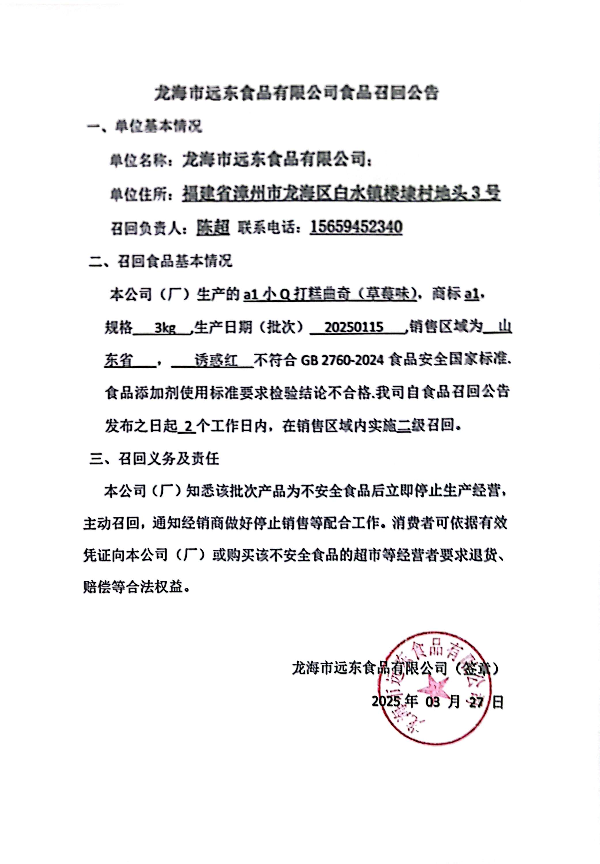 龙海市远东食品有限公司食品召回公告(20250327)