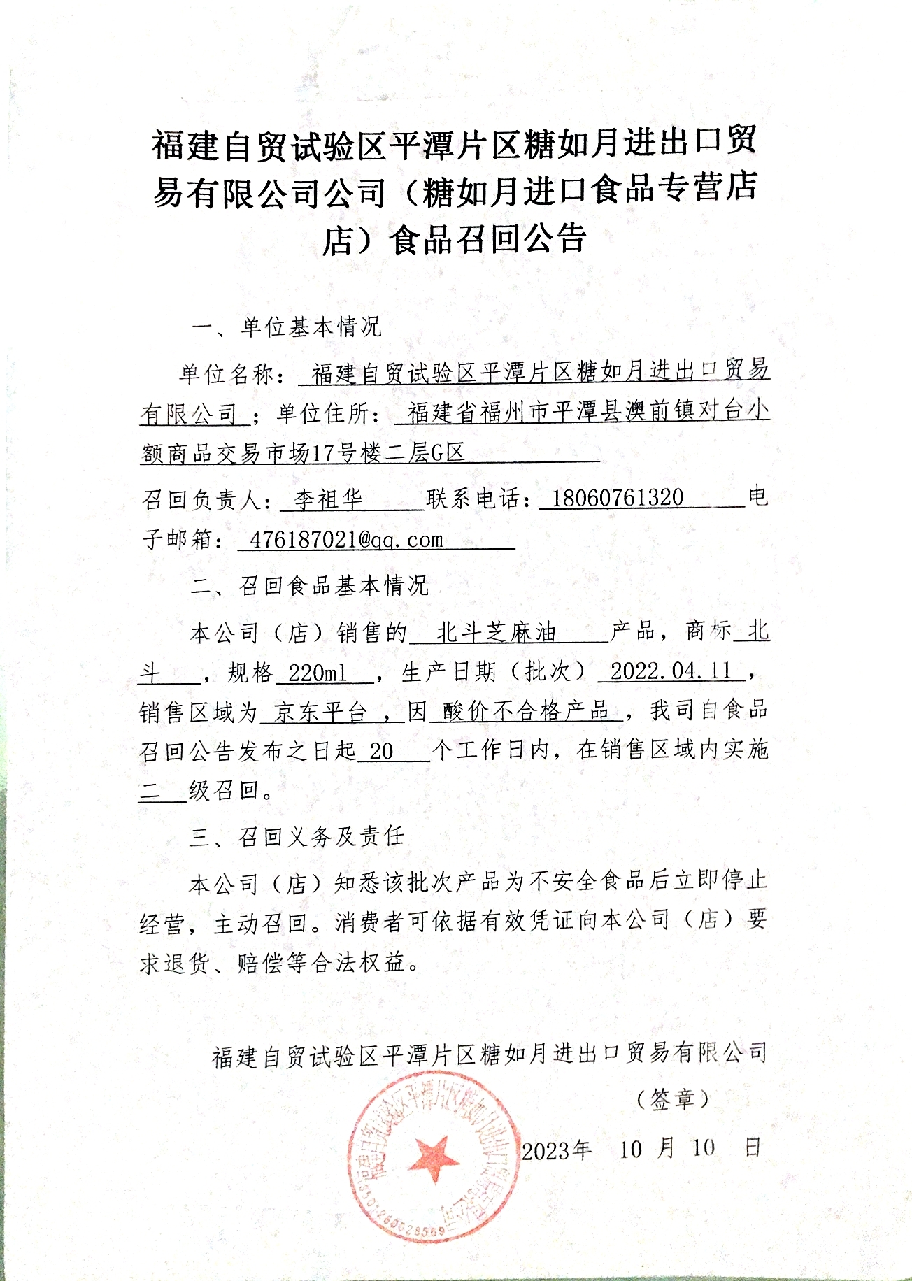 福建自贸试验区平潭片区糖如月进出口贸易有限公司(糖如月进口食品专营店)食品召回公告(20231010)