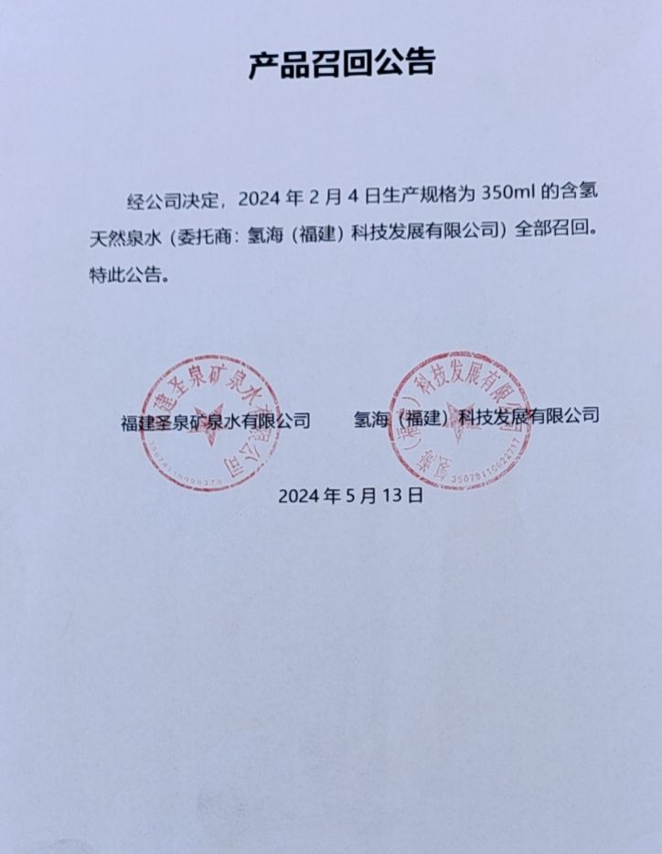福建圣泉矿泉水有限公司食品召回公告(20240513)
