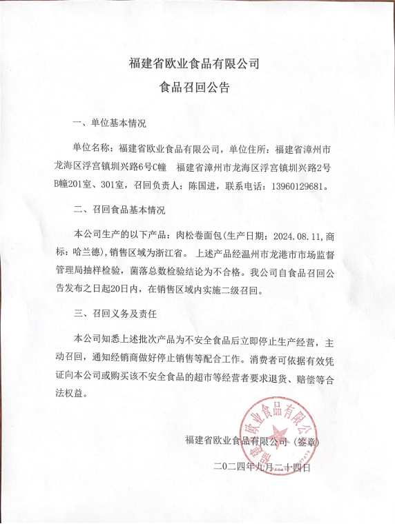 福建省欧业食品有限公司食品召回公告(20240924)