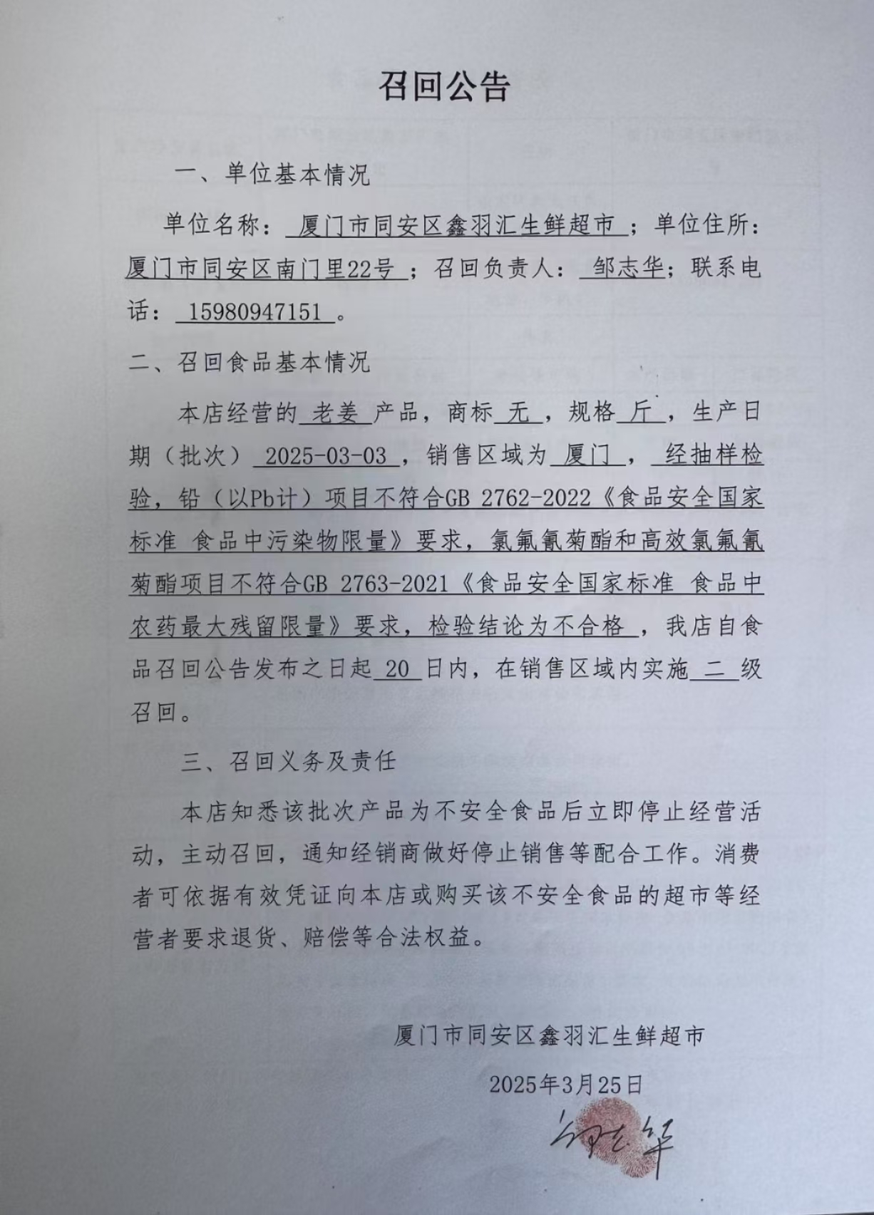 厦门市同安区鑫羽汇生鲜超市食品召回公告(20250325)