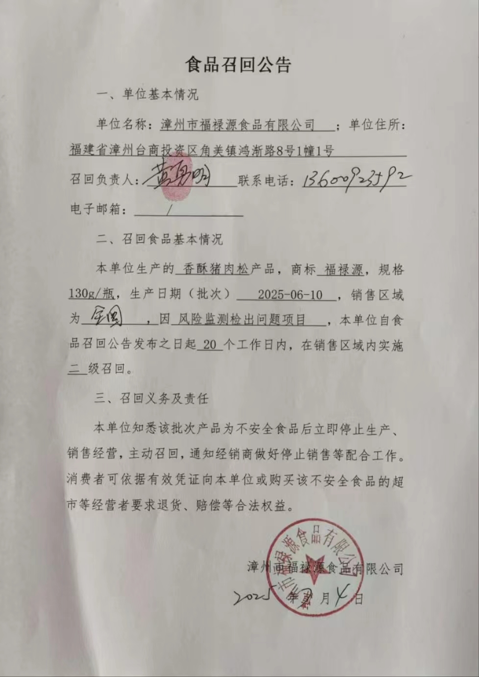 漳州市福禄源食品有限公司食品召回公告(香酥猪肉松)(20250704)