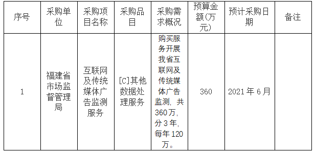 为便于供应商及时了解政府采购信息,根据《财政部关于开展政府采购意向公开工作的通知》(财库〔2020〕10号)等有关规定,现将(福建省市场监督管理局) 2021 年 6月采购意向公开如下: