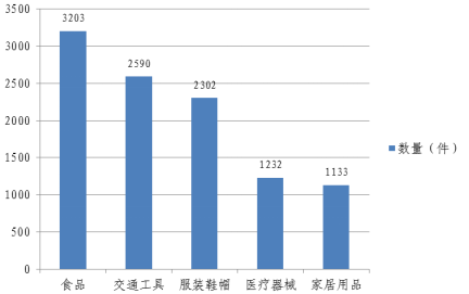 从投诉消费类型来看,商品类投诉计17517件,占投诉总量57.90 %。位于前五位的分别为:食品类3203 件(占商品类投诉18.29 %)、交通工具类2590 件(占商品类投诉14.79 %)、服装鞋帽类2302件(占商品类投诉13.14%)、医疗器械类1232件(占商品类投7.03%)、家居用品类 1133件(占商品类投诉6.47%)。