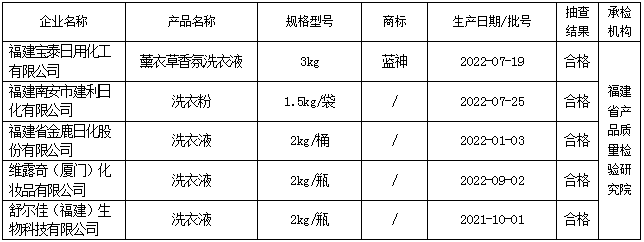 近期,依据《中华人民共和国产品质量法》和相关产品标准及抽查细则明确项目,福建省市场监督管理局组织对生产企业洗衣粉、洗衣液产品质量开展省级监督抽查。本次共抽查5家生产企业5批次产品,合格率为100%。