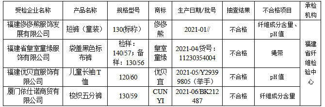 近期,依据《中华人民共和国产品质量法》,福建省市场监督管理局组织对儿童及婴幼儿服装产品质量开展省级监督抽查。本次共抽查51家生产企业生产的60批次产品,其中4批次不合格,不合格发现率为6.66%。