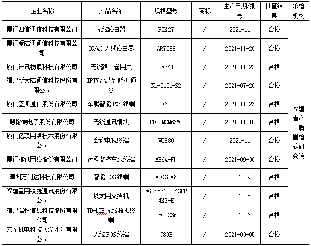 近期,依据《中华人民共和国产品质量法》,福建省市场监督管理局组织对电信终端设备开展产品质量省级监督抽查,抽查产品包括1606类的移动用户终端、1608类数据终端和1609类的多媒体终端,共抽查12家生产企业12批次产品,合格率为100%。