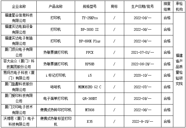 近期,依据《中华人民共和国产品质量法》和相关产品标准及抽查细则明确项目,福建省市场监督管理局组织对生产企业打印机产品开展省级监督抽查,本次共抽查10家生产企业10批次产品,合格率为100%。