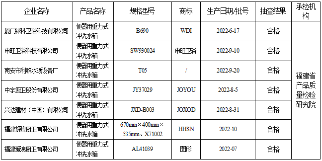 表1 福建省便器用重力式冲洗水箱产品质量省级监督抽查结果(合格)