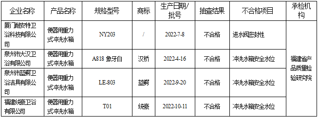 表2 福建省便器用重力式冲洗水箱产品质量省级监督抽查结果(不合格)